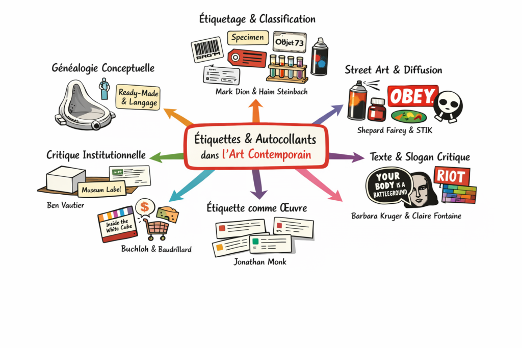 L'étiquette muséale révèle comment l'institution produit la légitimité artistique. L'étiquette de prix montre la complicité entre l'art et le marché. L'autocollant de rue démontre la possibilité d'une circulation alternative des images. Le sticker textuel prouve que le langage peut être retourné contre ses usages dominants. L'étiquette comme œuvre, enfin, manifeste la réflexivité constitutive de l'art contemporain, sa capacité à se prendre lui-même pour objet.